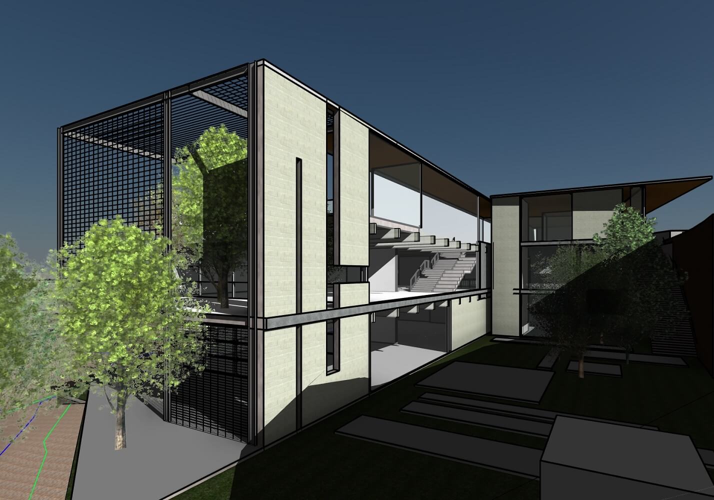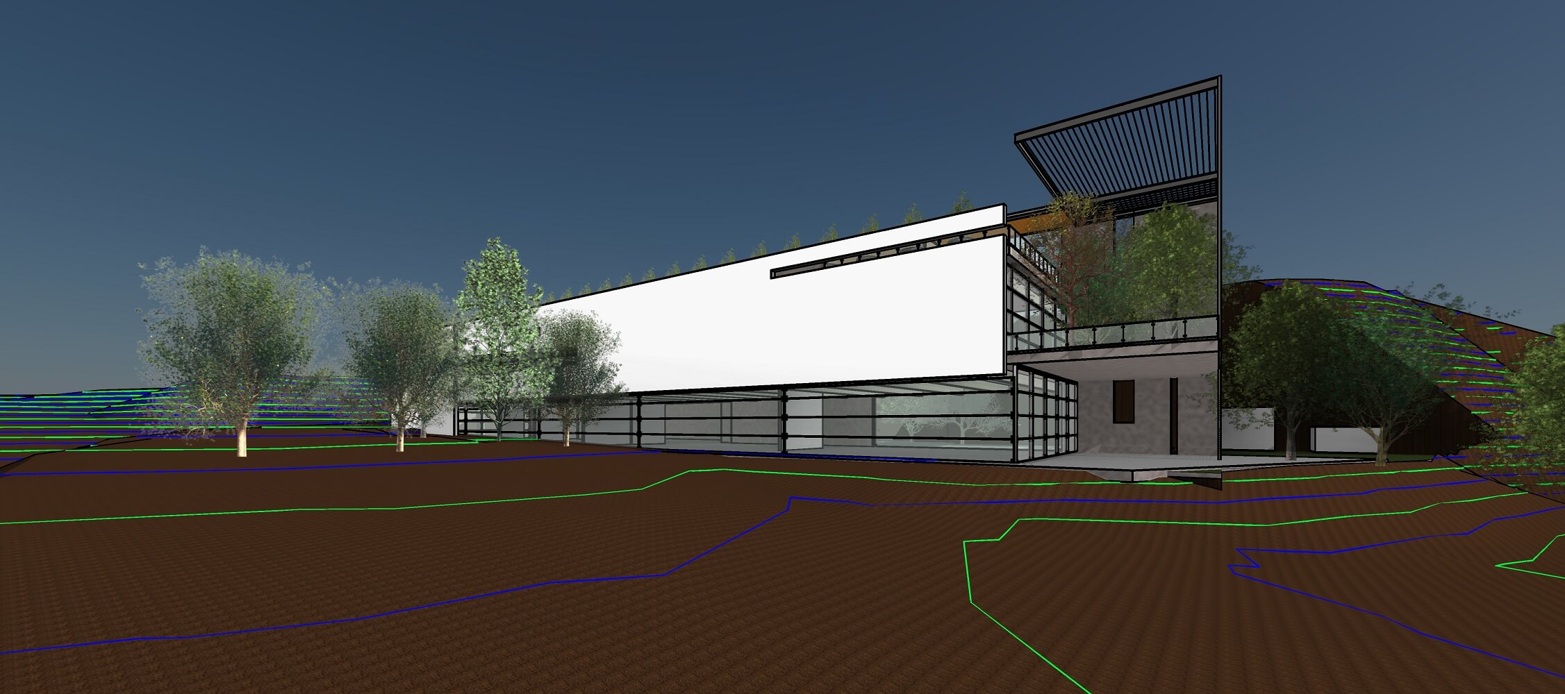 מהצד הדרומי, המבנה הנטוע בקרקע, הינו בעל מופע של 2 קומות, המייצרות חזית ארוכה של בנין ציבור, המלווה את הכביש הראשי. לכיוון מזרח פונה מרפסת המאפשרת להנות מנוף הגבעות הטבעיות, נוף הנשקף כמובן גם מהגג רחב הידים המשמש כמרפסת המחוברת למתחם הכניסה.