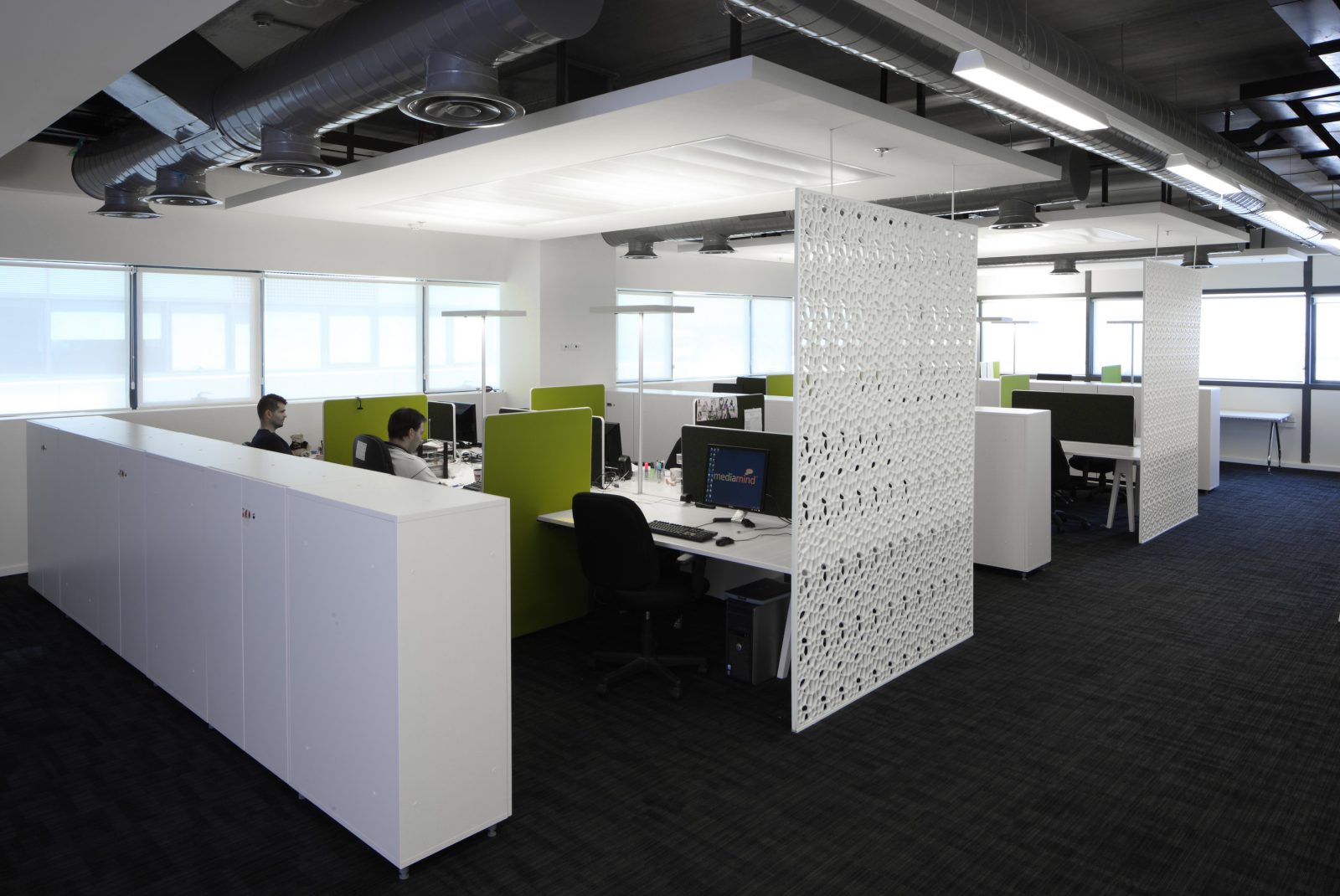 We have been assisting this international company for many years. Its offices in Herzliya span over 3 floors on a total area of around 3,700 m2. The company's work concept entails the use of open and shared workspaces while giving an option for privacy and conducting different sized meetings in blocks of meeting rooms that help to partition the space. The company has 40 different meeting rooms, training areas, welfare spaces, a large rooftop terrace, a cafeteria, and more.